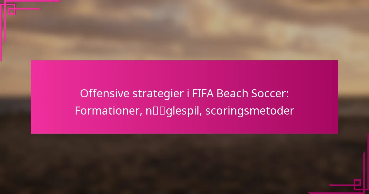 Vigtige offensive strategier i FIFA strandfodbold fokuserer på formationer, teamwork og scoringsmetoder, der maksimerer målmulighederne. Effektive angreb udnytter en kombination af taktiske formationer og nøglespil for at overmanøvrere modstanderne og udnytte scoringsmuligheder.